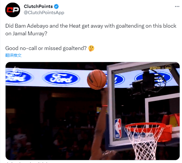 末节4分30多秒,穆雷持球杀到禁区抛投,阿德巴约大帽防守,慢镜头可以看出,阿德巴约盖帽前篮球已经下落,裁判应该吹罚阿德巴约防守干扰球,掘金应该拿到2分的。