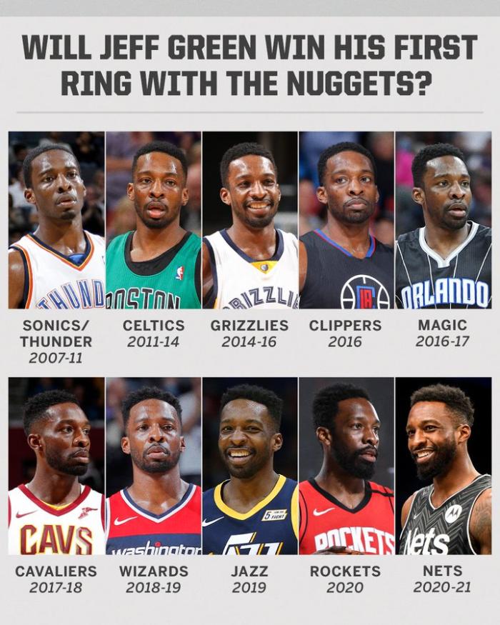 2021年,格林和掘金达成2年1000万美元合同,今年他随队杀进总决赛,掘金是格林职业生涯效力的第11支球队。