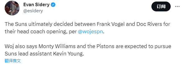 名记woj和shams都撰文揭秘太阳选帅内幕,5月15日解雇蒙蒂之后,太阳开始选帅工作,最终锁定5名新帅最终候选人——前猛龙主帅纳斯、前76人主帅里弗斯、前湖人主帅沃格尔、国王助教乔迪-费尔南德斯、太阳助教凯文-杨。