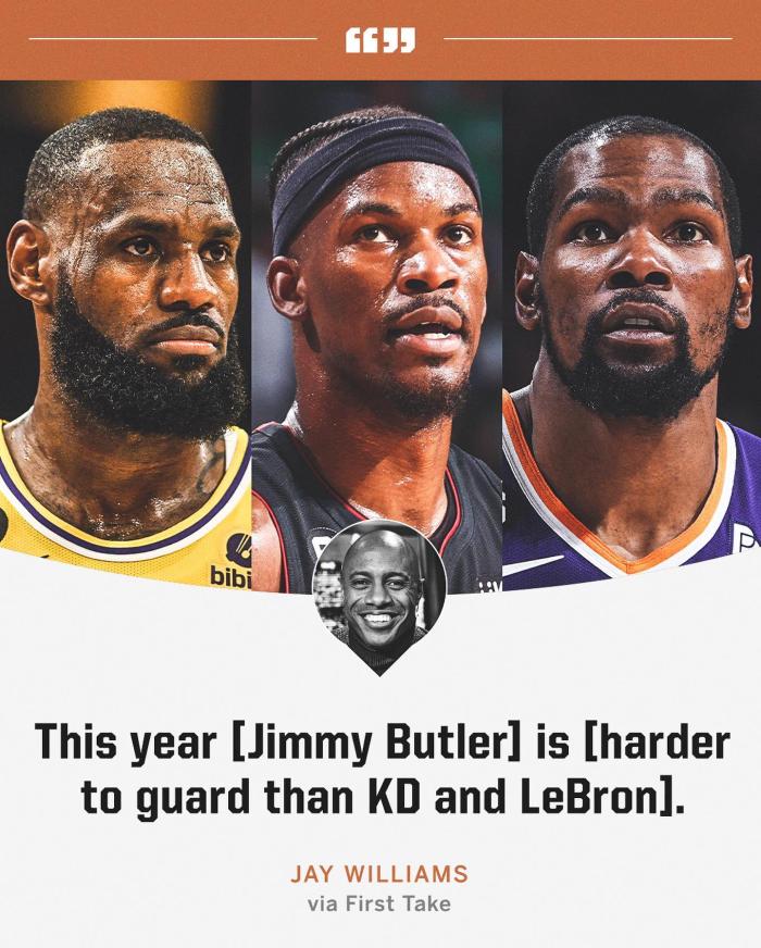 今年季后赛至今,巴特勒场均拿到27.6分7篮板5.8助攻2抢断0.7盖帽,带领热火一路黑进总决赛;对于巴特勒的表现,前NBA球员杰-威廉姆斯表示:今年的巴特勒比KD和詹姆斯更难防。