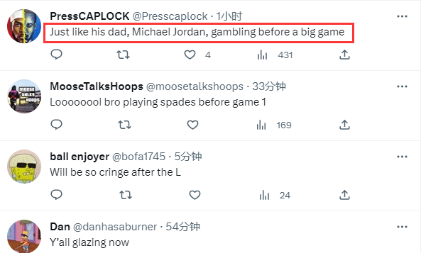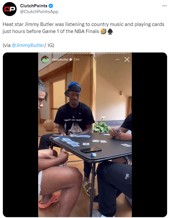 今年季后赛巴特勒在首轮对阵雄鹿时打出战神一般的统治力,被盛赞为当代乔丹,更被调侃为乔丹的私生子;如今总决赛G1开打前,巴特勒轻松打牌犹如效仿当年乔丹在总决赛前熬夜赌博。