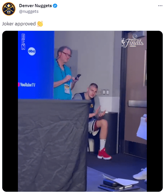 在全队备战总决赛G1时,约基奇的状态十分放松——与主帅马龙有说有笑,然后运球急停中投命中;三分打铁后约老师的“舞姿”十分有趣;约基奇还化身“球童”,站在篮下附近抢篮板然后为队友传球;连中三分后,约基奇呐喊:我手感太火热了。