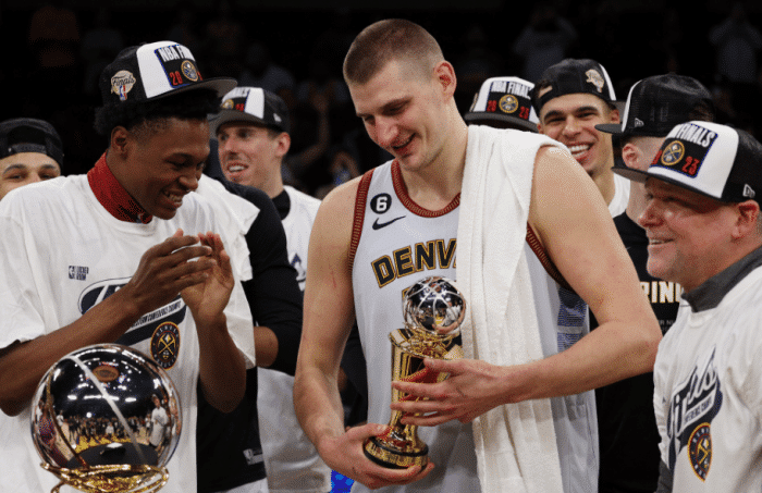 2022-23赛季,约基奇带领掘金取得53胜29负西部第一的战绩,季后赛首轮4-1轻松淘汰森林狼;西部半决赛4-2送别杜兰特和布克领军的太阳;西决决赛4-0横扫詹姆斯和浓眉领军的湖人,掘金夺得西部冠军挺进总决赛,约基奇全票夺得西决MVP。