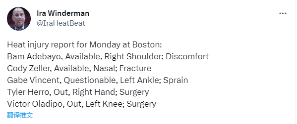 凯尔特人官宣东决G7伤病报告,布罗格登(右前臂拉伤)出战成疑,加里纳利继续休战;热火队希罗(右手骨折)、奥拉迪波(左膝伤病)继续休战,阿德巴约(右肩不适)和泽勒可以出战,文森特(左脚踝扭伤)出战成疑。