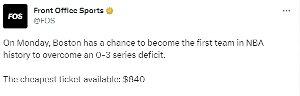 据报道,东决G7现场最低票价已经涨到840美元,当绿军0-3落后时,G7最低票价是380美元;当绿军3-3热火时,G7最低票价是667美元。