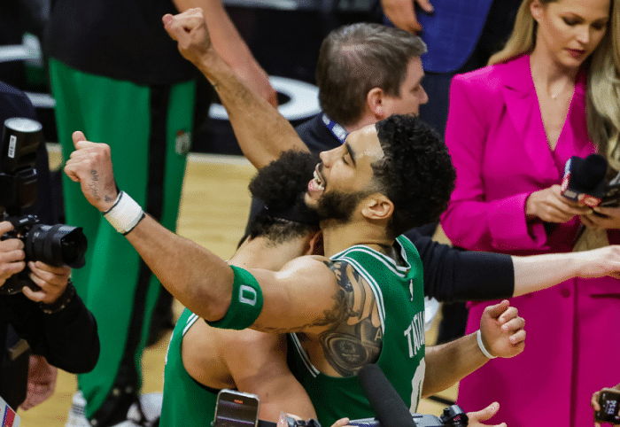 2018年东部首轮4-3雄鹿,2020年东部半决赛 4-3猛龙,2022年东部半决赛4-3淘汰雄鹿和东决4-3击败热火,2023年东部半决赛4-3淘汰76人,抢七生死战,塔图姆狂砍51分13篮板5助攻淘汰76人;塔图姆和布朗领军的凯尔特人已经在系列赛抢七取得5连胜,上次抢七输球还是2018东决3-4不敌詹姆斯领军的骑士。