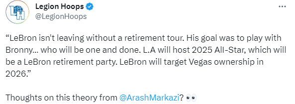多位名记预计詹姆斯不会退役,《洛杉矶时报》记者Arash Markazi表示勒布朗不会在没有退役巡演的情况下告别NBA,他的目标是和布朗尼一起打球,洛杉矶将举办2025年全明星赛,这将是勒布朗的退役派对,他的目标是在2026年在拉斯维加斯当老板。
