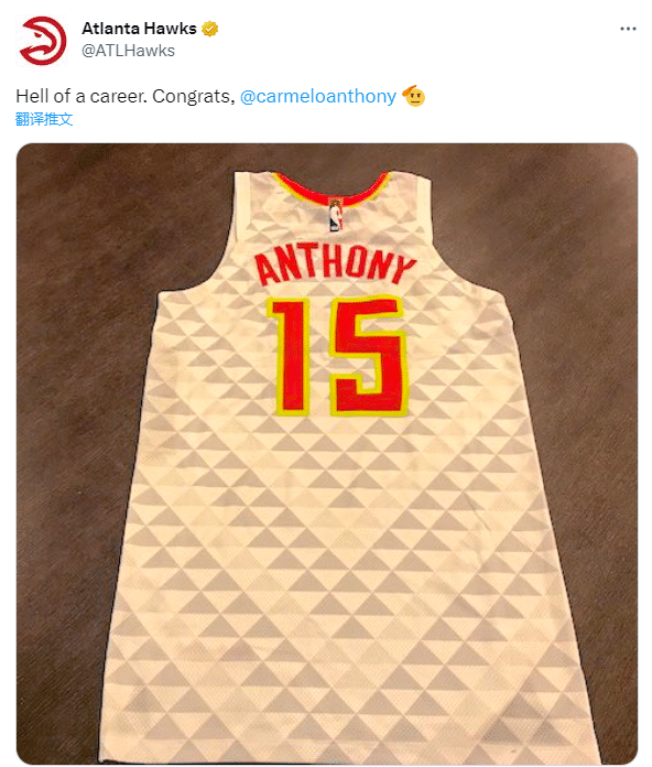 纽约尼克斯发推祝贺:“恭喜,你有一个很出色的职业生涯。”安东尼曾为尼克斯效力7个赛季,出战412场比赛,场均贡献24.7分7篮板3.2助攻。