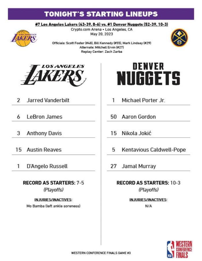 西决G2哈姆安排范德彪顶替施罗德重返首发,变阵仍遗憾惜败;西决G3湖人沿用上一场的首发,八村垒继续替补出战。