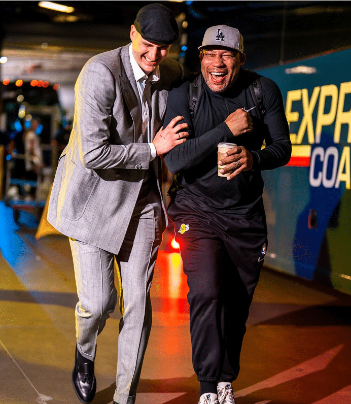 西决G2赛前,约基奇穿着西装、皮鞋抵达球馆,佩戴一顶小帽亮相,在球员通道中,约基奇搂着湖人主帅哈姆大笑入场,两人都咧嘴大笑;哈姆带着印有LA的棒球帽,背着双肩包并且拿着饮料,两人如此亲密一幕引热议,众美媒疯狂转发这一幕。