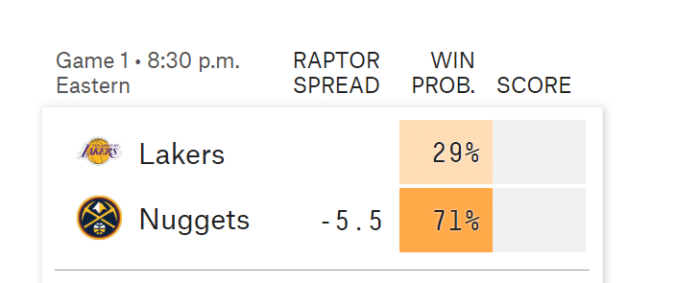 其他概率数据显示,绿军被看好78%的概率晋级总决赛,掘金是70%,湖人30%,热火22%。东部决赛和西部决赛G1的获胜概率也出炉了。