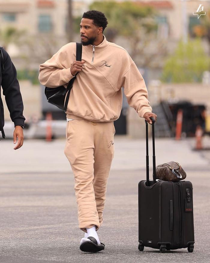 湖人众将出征G5关键一战,八村垒的表情相当霸气,众人推着行李箱,TT满脸笑容十分轻松,里夫斯则是背着双肩包轻装出征。