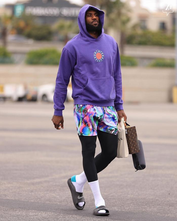 38岁的詹姆斯身穿紫色连帽卫衣,穿着拖鞋和花短裤十分抢镜,一脸严肃的表情;湖勇G4关键一战,詹姆斯全场拿到27分9篮板6助攻,关键时刻掌控比赛,率队拿下比赛,系列赛总比分3-1领先勇士。
