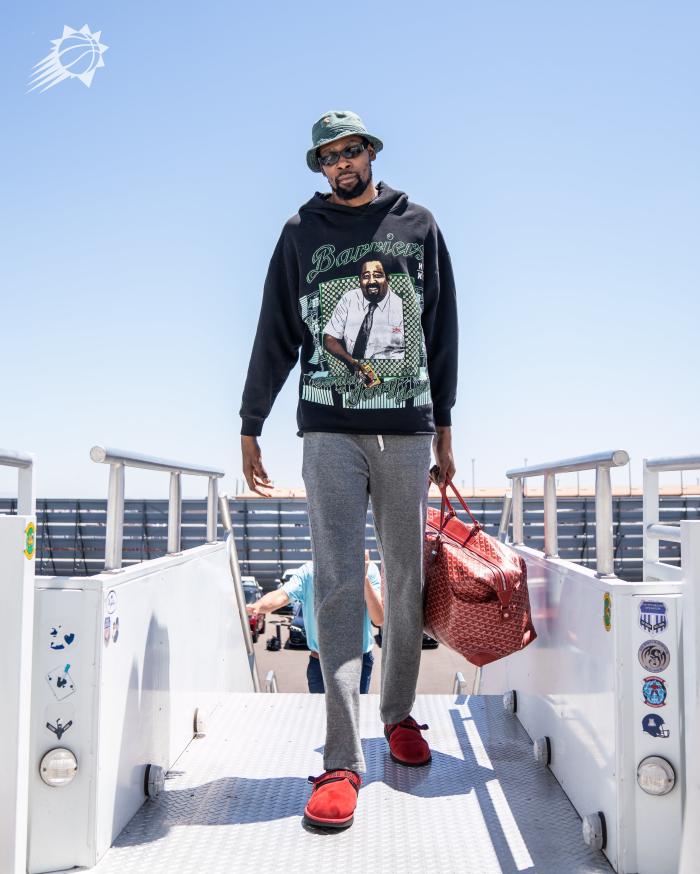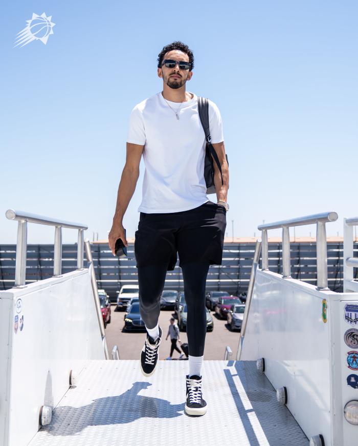 布克也戴着墨镜,身穿浅色牛仔裤和T恤,反戴棒球帽十分帅气,登机时也十分严肃;西部半决赛,布克连续3场轰下35+而且命中率奇高,今年季后赛至今,布克场均轰下36.8分7.4助攻5.1篮板,场均得分排在联盟第一,投篮命中率高达61.7%。