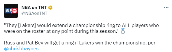 来源:24直播网05-09 09:4824直播网05月09日,据名记Chris Haynes报道,湖人总经理佩林卡已经确认,若湖人本赛季夺冠,他们将为本赛季在任何时刻效力过球队的球员颁发总冠军戒指,这意味着若湖人夺冠,威少和贝弗利等湖人旧将都能收到湖人的总冠军戒指。