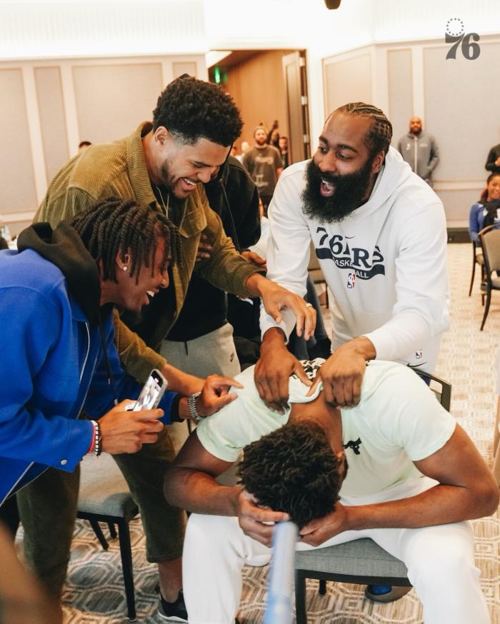 76人全队一起庆祝了5分钟,然后回到训练场继续备战半决赛G2。
