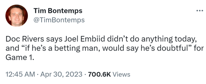 你的位置: 24直播网 篮球直播 NBA 恩比德大概率缺战G1!名记称若打前两场算惊喜 今夏预计无缘世界杯