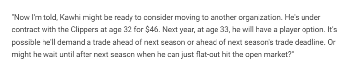 贝勒斯说道:“现在有人告诉我,科怀(莱昂纳德)可能已经准备考虑去另一支球队打球了。32岁的他还在快船的合同期内,下赛季的薪水是4600万美元。等到他打完下个赛季,33岁时会拥有球员选项。他可能会要求在下赛季前或者下赛季交易截止日前离队,或者他可以等到下赛季结束后跳出合同,进入自由球员市场?”