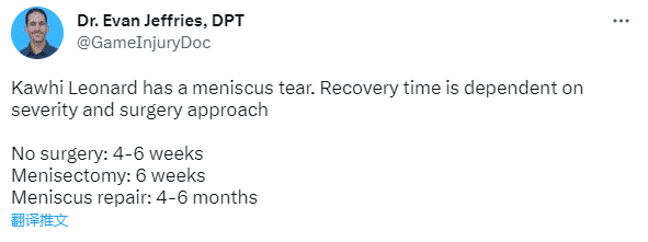 医学专家Evan Jeffries详解小卡的伤情,发推表示莱昂纳德遭遇半月板撕裂,康复时间取决于受伤的严重程度,不做手术的话,需要休养4-6周;接受半月板切除术的话,需要养伤6周;接受半月板修复手术,至少伤停4-6个月。