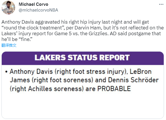 来源:24直播网04-26 09:4524直播网讯04月25日,湖人全队出征G5,詹眉满脸笑容十分轻松;湖人官方公布G5伤情报告,浓眉(右脚应力伤势)、詹姆斯(右脚酸痛)、施罗德(右脚跟腱酸痛)大概率出战(75%出场可能),伤病报告与之前一样,预计他们都会出战,不过哈姆透露浓眉的右臀伤势加重,将接受全天候治疗,预计带伤出战。
