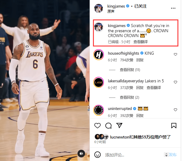 来源:24直播网04-24 11:4324直播网讯04月24日,湖人系列赛大比分2-1领先,詹姆斯在社交媒体晒G3个人集锦,配文写道:注意,你是在一顶皇冠面前(王冠6号);老詹疑似向狄龙宣战,G4或爆发狂砍40+冲击赛点,另外外界预测湖人和勇士很有可能会师西部半决赛。