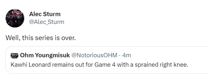 名记Alec Strum转发莱昂纳德缺席G4的报道,并感慨道:“这轮系列赛已经结束了。”知名数据网站FiveThirtyEight显示,快船的晋级概率只剩下13%,预计后续还会继续下跌。