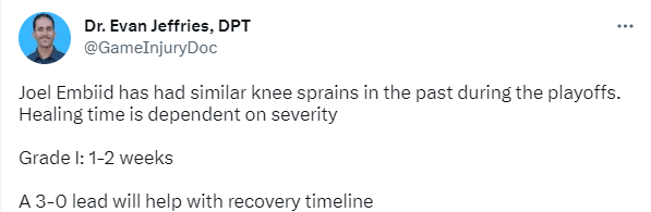 医学专家Evan Jeffries表示恩比德膝盖扭伤,愈合时间取决于扭伤程度,一级扭伤需要休战1-2周。