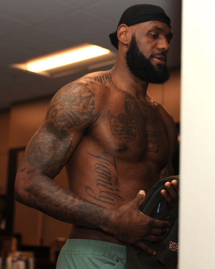 湖人众将早早来到球馆,詹姆斯、浓眉等人都是帅气亮相,来到球馆后,38岁的詹姆斯脱掉上衣,赤膊出镜准备前往球场热身。