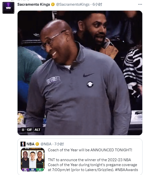 其实在联盟正式公布布朗获得最佳主帅前,国王官方晒布朗表情包,已经提前庆祝了;布朗正式获奖后,国王官方晒照祝贺。