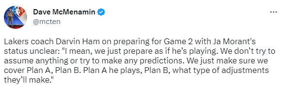 对于莫兰特的情况,湖人主帅哈姆表示:我们会按莫兰特将出战去进行比赛准备,我们不会尝试去预估任何可能会发生的情况。我们会准备好A计划与B计划,A计划——莫兰特会出场,B计划——灰熊会做出的任何调整。