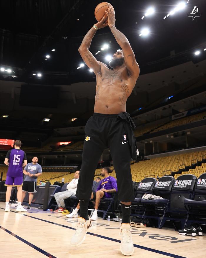 湖人众将在灰熊球馆内备战G2,训练期间,詹姆斯和比斯利加练底角三分,练着练着,38岁老詹脱掉训练T恤,继续赤膊训练;系列赛G1,詹姆斯16投8中拿到21分11篮板5助攻3抢断2盖帽,三分球8中3。