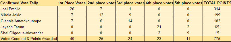 值得一提的是,联盟已有40位媒体人的MVP投票结果曝光,恩比德获得26张第一选票,7张第二选票和1张第三选票,总得分为314分;约基奇获得7张第一选票、12张第二选票和9张第三选票,总得分为199分;字母哥7张第一选票,总得分为182分。