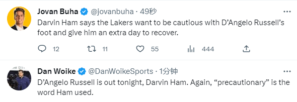 上一场拉塞尔因左脚酸痛提前退出比赛,如今天对阵爵士,拉塞尔的出战状态从大概率降级为出战成疑,随后哈姆宣布拉塞尔缺席比赛。