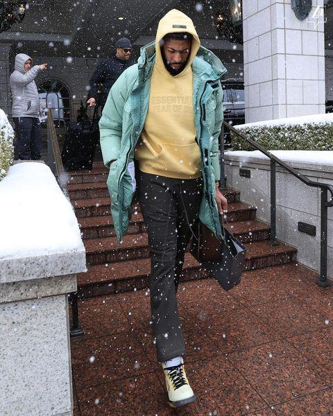 湖人众将冒着风雪前往爵士主场,詹姆斯、里夫斯等人都穿着卫衣,没有穿羽绒服,其中38岁老詹穿着拖鞋以及撅嘴表情十分抢镜;浓眉则是套着羽绒服,包裹地比较严实。