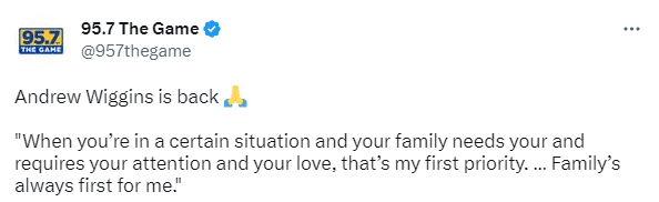 维金斯身穿勇士训练服正式亮相,和鲍勃-迈尔斯一起接受采访,维金斯谈到回归,表示:当你处于某种情况并且你的家人需要你,需要你的关注和爱时,那(陪伴家人)是我的首要任务,家庭对我来说永远是第一位的。