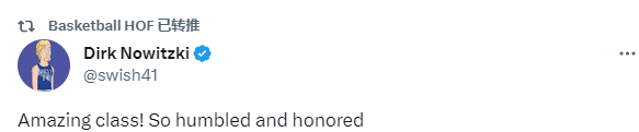 诺维茨基转发入选名人堂推文并发推写道:了不起的一届(名人堂)!我深感谦卑与荣幸。
