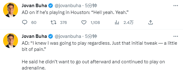 赛后谈到带伤出战,浓眉表示:我知道我无论如何都得继续比赛。只是,最初的扭伤有一点痛。浓眉崴脚后拒绝离场,而且浓眉表示下一场对阵火箭他会打的。