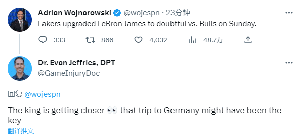 自从2月27日以来,詹姆斯因右脚伤势已经连续缺席了13场比赛,伤后首次被列为小概率出战,这表明他正接近复出,医学专家Evan Jeffries表示国王越来越接近复出,德国之行可能是伤势康复的关键。