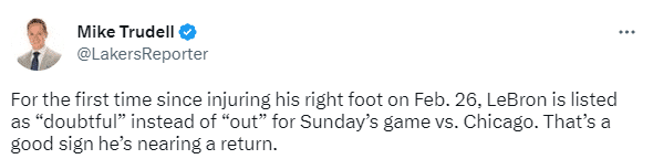 来源:24直播网03-26 11:2324直播网讯03月26日,湖人官方正式宣布,下一场对阵公牛,詹姆斯被列为小概率出战(25%可能性出战),医学专家称其接近复出,这是詹姆斯右脚肌腱损伤后首次被列为出战成疑,迎来复出的好兆头,也是湖人冲击西部前六的重大利好。