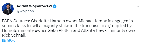 据名记Woj报道,夏洛特黄蜂老板迈克尔-乔丹正在进行严肃谈判,他打算将球队的多数股权出售给黄蜂队小股东加布-普洛特金和亚特兰大老鹰小股东里克-施纳尔领导的集团;目前双方还没有达成交易,但乔丹大概率会出售股权。交易完成后,加布-普洛特金与里克-施纳尔将成为黄蜂队的联合总裁,乔丹将保留球队的少数股权。