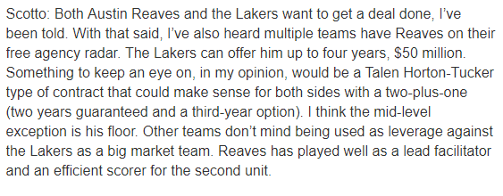 据报道,里夫斯和湖人均有意达成续约,湖人能够为里夫斯提供一份最多4年5000万美元的合同,双方可能签下一份2年保障+第3年球员选项的合同,他的情况和当初的卡鲁索相似,湖人想要留下他,他也想留在湖人,不过里夫斯将引起多支球队的争夺,若其他球队给里夫斯1200万-1500万美元的年薪,他可能离开湖人。