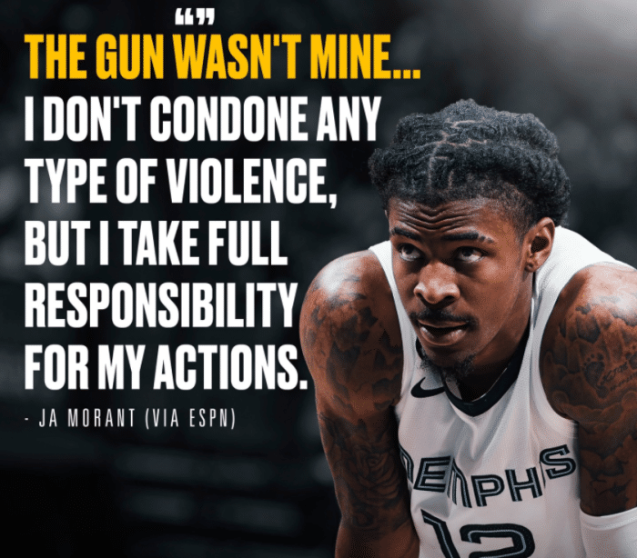 莫兰特持枪门事件后首次亮相,接受ESPN专访,与杰伦-罗斯正面对话,期间莫兰特回应:那把枪不是我的!我不会容忍任何类型的暴力,但我必须对自己的行为承担全部责任。我犯了一个严重的错误。