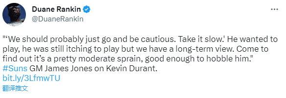 太阳总经理詹姆斯-琼斯谈到杜兰特的伤势,表示:我们要谨慎地对待这件事。慢慢来'。他想上场,他仍然很想上场。虽然检查结果显示这次只是一个相当温和的扭伤,只是让他走路有些一瘸一拐,但我们必须要站在更长远的角度出发。