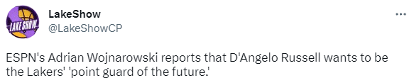 名记Woj在节目中表示:拉塞尔非常渴望与湖人再续前缘,你看到了他复出首战对阵猛龙的表现。打得非常出色并带队取胜。今天又一次表现出色,他想成为这支球队未来的控球后卫,今年夏天他将成为自由球员。”