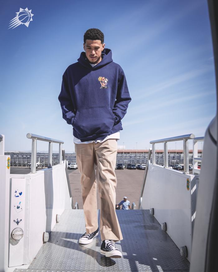 布克身穿连帽卫衣、双手抄兜登上飞机;保罗也是身穿运动装,把外套绑在腰上;艾顿戴着墨镜,还戴着大金链子,他们率队飞往湾区出征客场;杜兰特因脚踝扭伤未随队出征,因伤休战,无缘战旧主。