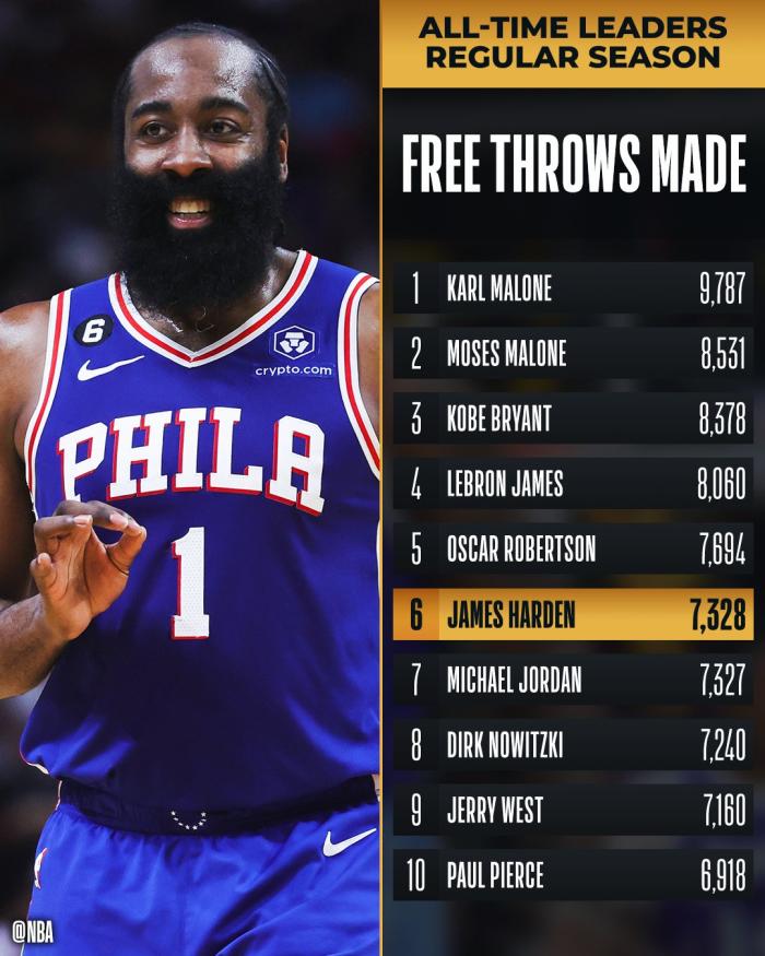 来源:24直播网03-11 11:2224直播网讯03月11日,76人主场21分逆转开拓者,哈登全场14投6中、三分8中2、罚球5中5拿到16分8助攻9篮板,哈登生涯罚球命中数正式超越乔丹,升到NBA历史罚球命中榜第六位;哈登关键三分给力,生死时刻夹手臂进攻犯规险葬送比赛,恩比德39分7篮板4助攻上演1.1秒绝杀。