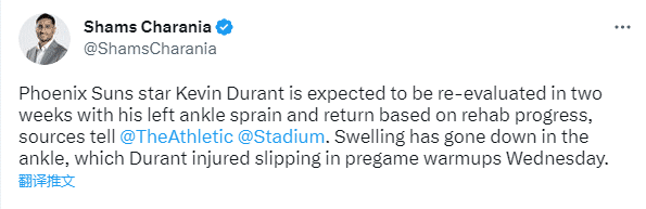 杜兰特伤势有多严重?据报道,太阳内部担忧杜兰特遭遇了脚踝二级扭伤,如此伤病一般需要休战4-6周,这意味着KD可能常规赛报销,也可能错过季后赛的开始阶段。