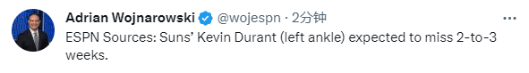 太阳本赛季常规赛将在4月10日结束,换言之,大概还剩4周左右,常规赛就结束了,所幸杜兰特至少伤停2周,伤势没有严重到常规赛报销。
