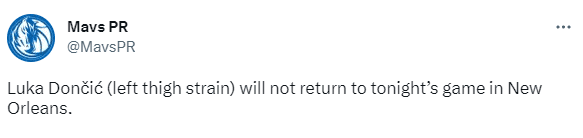 独行侠官宣东契奇左大腿拉伤,本场比赛因伤不会回归。