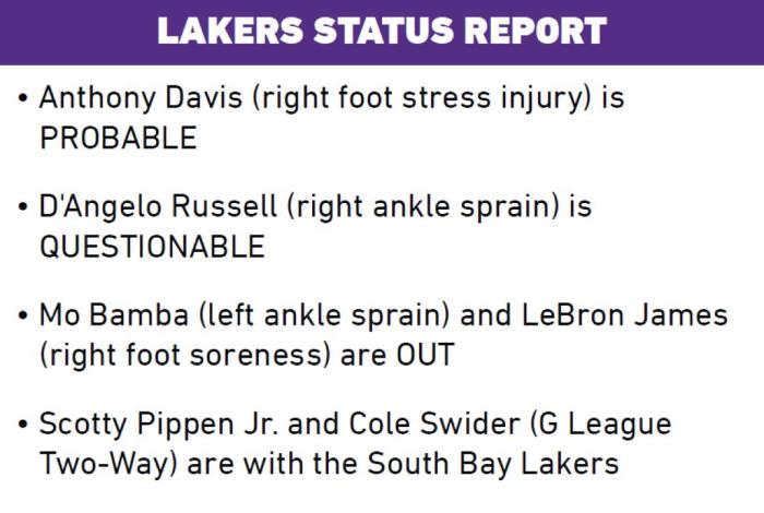 来源:24直播网03-07 10:1224直播网讯03月07日,湖人官方公布下一场对阵灰熊的伤病报告,浓眉(右脚应激伤病)大概率出战,拉塞尔(右脚踝扭伤)出战成疑,詹姆斯(右脚肌腱受伤)和班巴(左脚踝扭伤)因伤休战,皮蓬和斯威德仍在发展联盟;湖人至少4人缺战灰熊,仍旧没有詹姆斯的具体复出时间,拉塞尔伤势仍未痊愈。